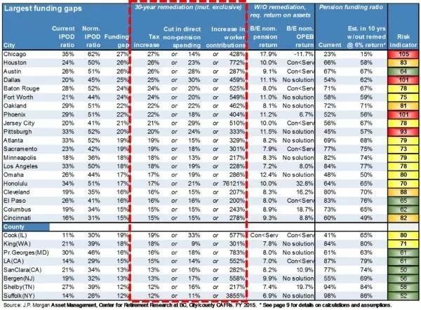 下面的图表显示了美国各州、各市、县的“IPOD”比率。这代表市政财政收入占需要支付直接债务所产生的利息的百分比,并且在30年的时间里,完全摊销养老金和退休人员的医疗保健义务(假设保守的计划资产回报率为6%).