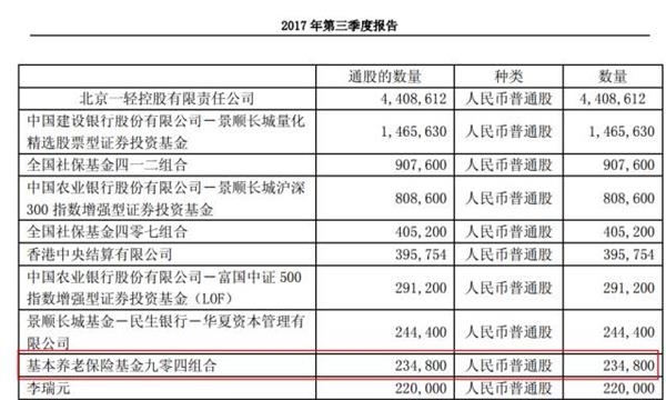 数据显示,今年年中,九阳股份发布2017半年报显示,基本养老保险基金八零二组合持有286.7万股,占流通股0.37%;同时,正海磁材的前十大流通股东中,也新进了基本养老保险基金八零二组合,持有392.92万股,占比0.53%;还有,首商股份半年报也显示,基本养老保险基金八零一组合买入180万股,占比0.27%。