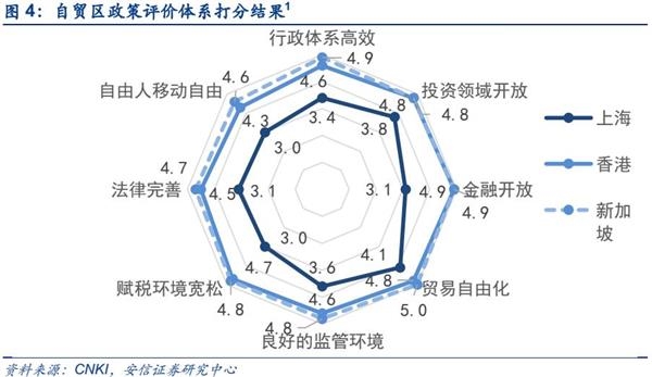 自由港,“自由”是其存在的灵魂,我们从商务部国际贸易经济合作研究院课题组的论文中对上海和香港、新加坡当前政策进行的评估中可以发现,上海目前在贸易自由化和投资领域开放领域获得了4.1和3.8分,距离香港和新加坡的水平较近,但在金融开放,自由人移动自由等领域,仍有较大进步空间。