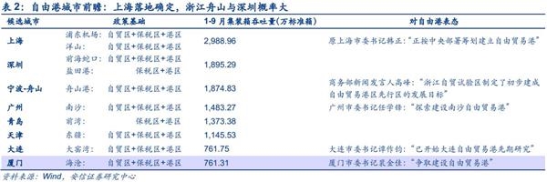 中国有哪些城市有望获得自由港的政策?我们根据港口基础、政策基础和目前表态三方面综合评估各城市获得自由港的可能性。首先,繁忙的港口是自由港发展对外贸易和各种离岸业务的基础,因此我们将拥有大型集装箱码头作为自由港的先决条件,将国内港口根据今年1-9月集装箱吞吐量进行排序,得到了上海、深圳、宁波-舟山等城市;其次,当前已经成为自由贸易区试点或者是综合保税区是成为自由贸易港的必要政策基础,排名靠前的几大港口多满足这一条件;最后,通过分析相关官员的表态分析这些城市建设自由港的确定性和进度。