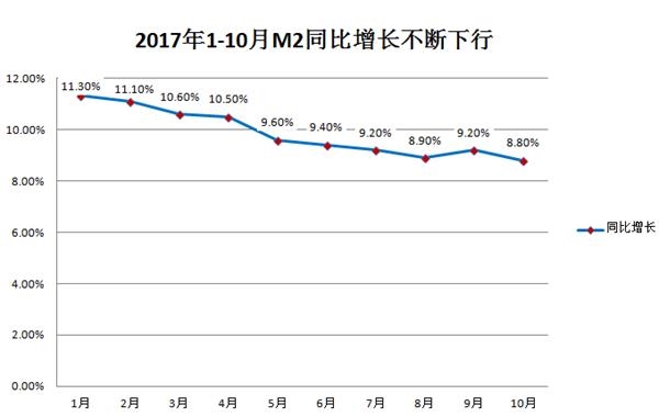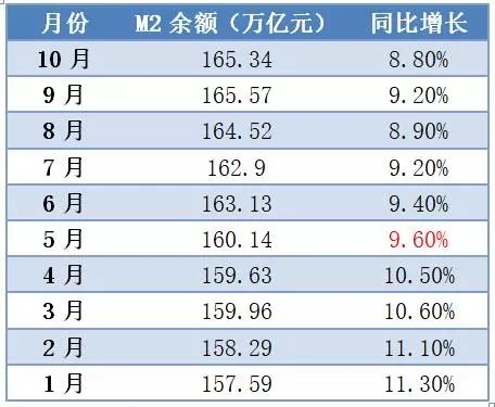 自1990年有数据统计以来,我国的M2增速长期保持2位数的增速,M2增速保持在10%-30%增长区间,而今年M2增速却破天荒回落到个位数时代,10月末更是创造了8.8%的低点,这一数据也刷新了27年来的历史新低。