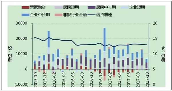 10月新增人民币贷款6632亿元人民币,明显低于市场预期,除了10月属于季节性走低之外,主要还在于居民短期贷款的明显下滑。具体而言,2017年3月以来,居民短期贷款均值在2100亿远左右,且9月一度高达2537亿元,但9月下旬以来,政策对居民消费贷的监管逐渐升温,使得10月居民短贷下降至仅为791亿元,政策层的监管对新增贷款的影响逐渐显现,直接导致了10月新增贷款的明显走低。