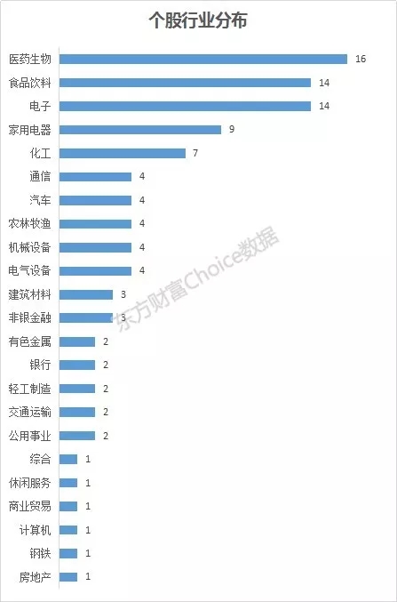 至于这102只个股,可以发现,医药生物(申万一级行业,下同)类个股最多,有16家。其次是电子和食品饮料,都有14家。