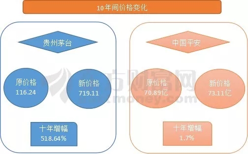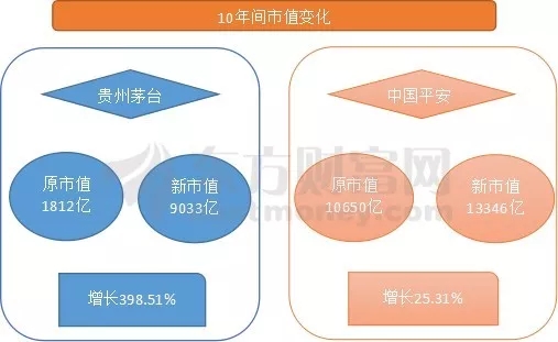 十年间贵州茅台市值增长398.51%,股价增长518.64%。而在这十年中,中国平安却没什么明显变化。