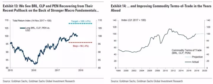 看多新兴市场资产是高盛的一大重点推荐。如上文提到,2018年全球经济将继续保持强劲且一致的增长姿态,而新兴市场经济则有更大的上涨空间,经济的快速增长通常也会带动该地区的股市上涨。