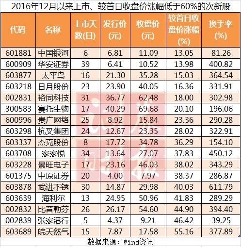 自2016年初IPO新规以来,上市至今涨幅最大的新股是海天精工(601882),达929.63%,其次是名家汇(300506)738.93%、中潜股份(300526)607.87%,此外华锋股份(002806)、兴齐眼药(300573)、丝路视觉(300556)、平治信息(300571)等个股涨幅均在500%以上。不过也有一些“倒霉蛋”,上市不逢时,正赶上新股“大甩卖”,早早开板,尤以去年12月份的新股为甚。时报君整理了2016年12月份以来,较首日收盘价涨幅低于60%的个股,大伙看看是不是可以捡捡漏。