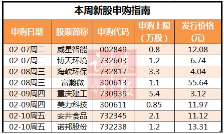 虽然今日无新股申购,但从明天(2月7日)开始,新股申购将重新回到正常节奏,本周将有8只新股申购,2月7日为博天环境、威星智能,2月8日为富瀚微、海峡环保,2月9日为美力科技、重庆建工,2月10日为诺邦股份、安井食品。