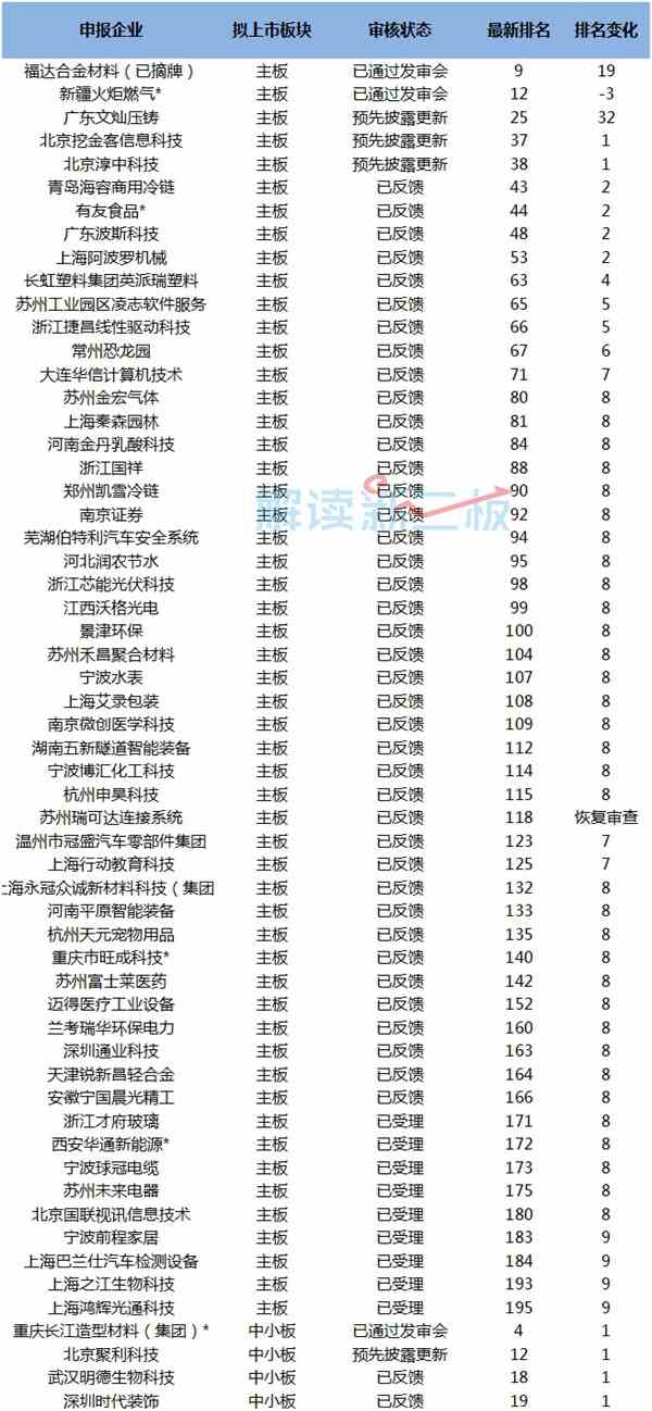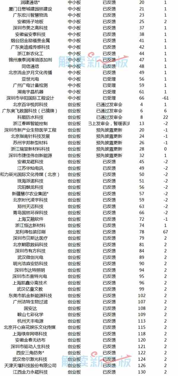 6家排队企业已通过发审会:新疆火炬、百华悦邦、长江材料、科顺防水、福达合金和奥飞数据(后两家已摘牌);1家暂缓表决:春晖智控;9家预披露更新;96家已获证监会反馈、25家获证监会受理。