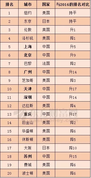 与2016年的城市排名相比,2035年纽约、东京依然是全球前两大城市,伦敦上升一位跻身第三,洛杉矶降至第四。