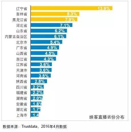 图中可以清晰地看到,东北三省高居前三名,总占比高达30.1%。毫无疑问,东北主播已经成功占领了直播主战场,此外,2016年微博“超级红人节”票选出的十大网络主播中,有6个是东北人。在明星领域,东北主播更是段位颇高,赵本山曾在微博多次为女儿在映客参加的直播选拔比赛拉票,其旗下的“赵家班”也在各个直播平台里非常活跃。