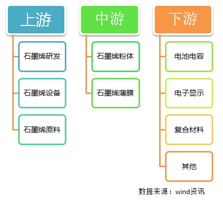 石墨烯产业链主要可以分为上、中、下三大部分,其中上游部分主要是石墨烯研发、石墨烯设备、石墨烯原料;中游主要是石墨烯制备,包括氧化石墨烯以及石墨烯薄膜;下游主要是石墨烯用途,包括能源、电子、复材、环保等领域。
