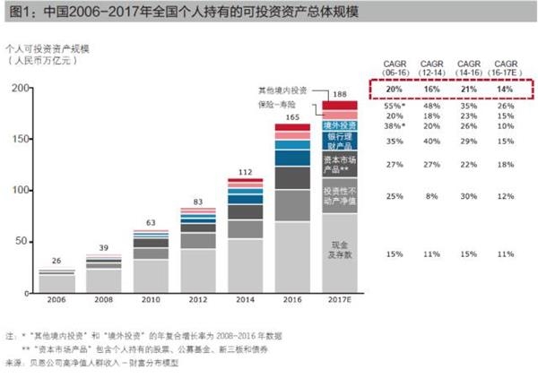 从下图可见,在全国个人投资规模比例中,现金及存款从2006年至2017年来都占了大头,往后依次是投资性不动产、资本市场产品、银行理财产品、境外投资、保险——寿险、其他境内投资。