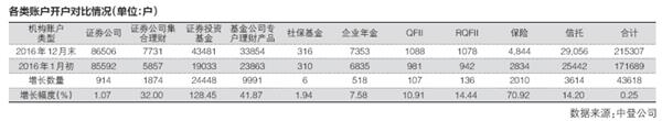在2016年亿元级别账户大增30%的情况下,《每日经济新闻》记者根据中登公司公布的数据统计发现,2016年1月初以基金、保险、信托为代表的机构及产品A股账户数合计17.1689万户,而2016年12月末上述机构账户数增长到21.5307万户,增幅为25.41%。