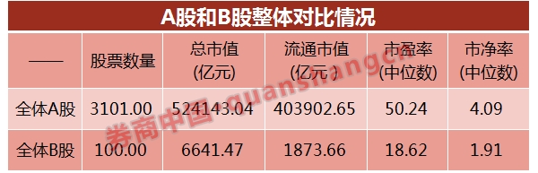 如果整体估值数据还比较抽象,更具化的对比是同一家公司发行的A/B股,在同股同权的背景下,B股市场交易的股票就像是在打折出售,动不动就是五折、四折和三折,而二者的投票权和收益权都没有差异。