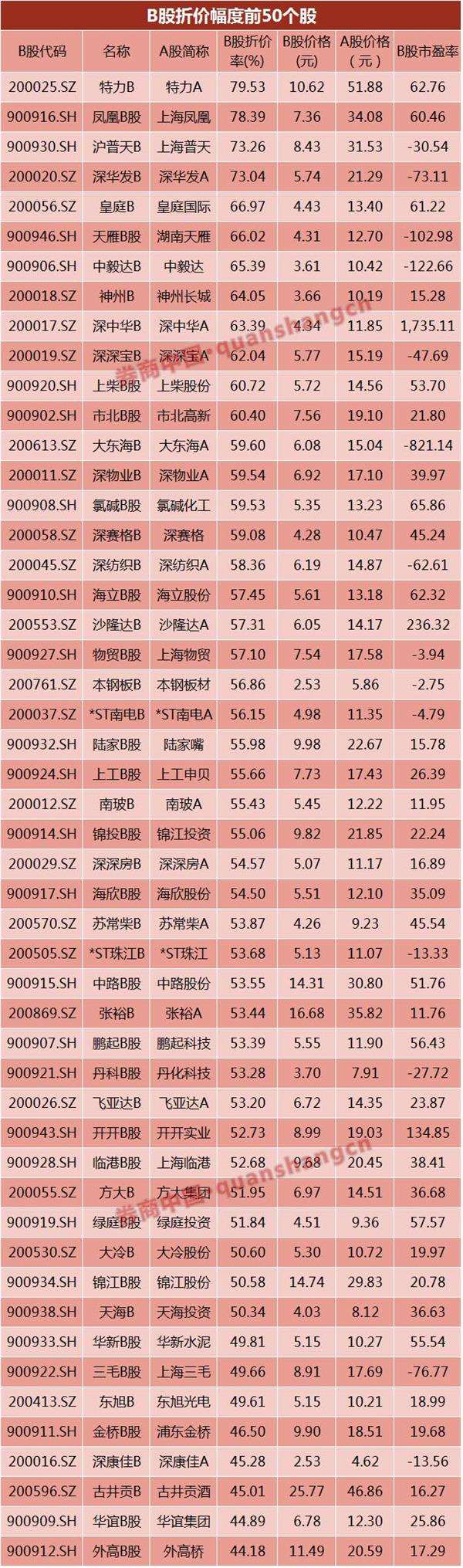 除此之外,凤凰B股、沪普天B和深华发B等3只B股目前的对A股折价率分别达到78.39%、73.26%和73.04%,这些股票的打折力度也超过3折。