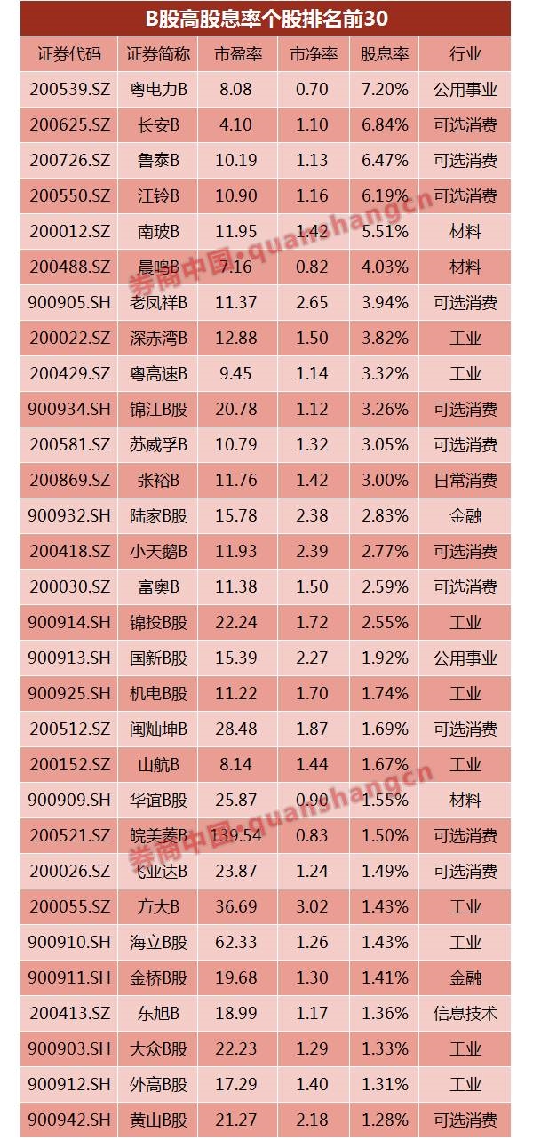 截至目前数据,B股市场100只个股中有16只过往12月股息率超过2%、有13只股息率超过3%、有5只股息率超过5%,粤电力B、长安B、鲁泰B和江铃B等4只个股的股息率更超过6%,分别达到7.2%、6.84%、6.47%和6.19%。