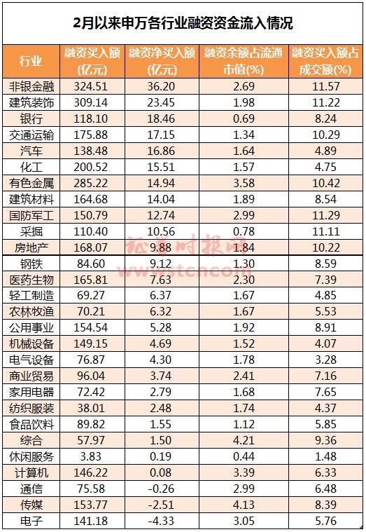 数据显示,2月以来,申万28行业中,有10个行业融资净买入金额超过10亿元,其中非银金融行业居首,达36.2亿元,建筑装饰行业排名第二,为23.45亿元,另外,银行、交通运输、汽车、化工等行业融资净买入规模居前。