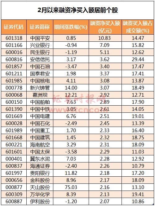 个股方面,2月以来,24股融资净买入金额超过2亿元,其中中国平安净买入金额达10.83亿元居首,兴业证券和民生银行紧随其后,分别达7.09亿元和5.11亿元。股价表现方面,天山股份表现最为优异,累计涨幅达75.03%。