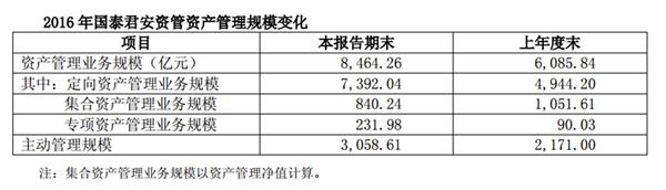 上述年报显示,截至2016年末,国泰君安资管的资产管理规模为 8,464.26亿元,较上年末增长39.08%,资产管理业务受托资金排名行业第 3 位,收入排名行业第 2 位;主动管理资产规模 3,058.61 亿元,同比增长 40.88%。