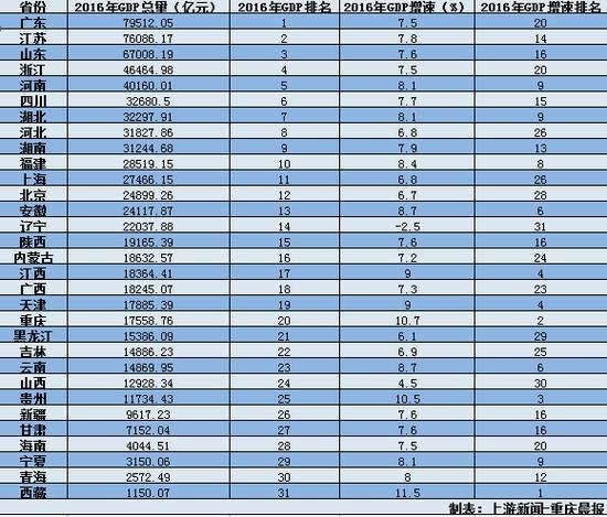 2016年全国31省区市的经济总量,仍由广东、江苏和山东三省领跑。其中广东经济总量达到7.95万亿元,同比2015年7.28万亿元增长7.5%。