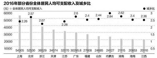 据媒体报道,2016年有6个省份的全体居民人均可支配收入突破了3万大关。其中,上海和北京两大直辖市均突破5万大关,上海以54305元位居榜首,北京以52530元紧随其后。