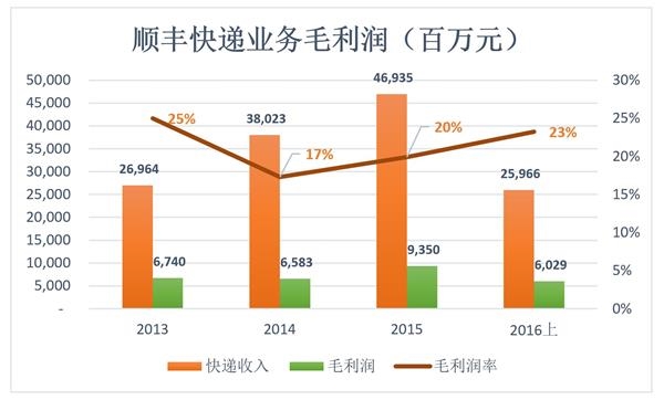 2014年起,顺丰快递业务毛利润率呈现上升态势。2016年前六个月的毛利润约60亿,毛利润率为23%。