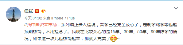 但斌今日微博发文表示,系列酒正步入佳境;普茅已经完全放心了;定制茅鸡茅等也超预期热销,不用挂念了。我现在比较关心的是15年、30年、50年、80年陈茅的情况,如果这一块儿也热销起来,那就太完美了。