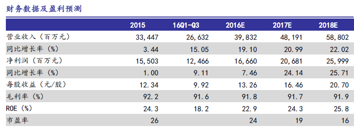 同时申万宏源也将茅台价格调升至450元, 申万宏源在研报中表示,预测 16-18 年 EPS 为 13.26、 16.46、 20.70 元,同比增长 7%、 24%和 26%(由于大量收入在预收款中未确认,判断真实业绩比我们预测要高,真实业绩对应 17 年 PE 在 18x),上调一年目标价到 450 元,对应 17 年报表业绩估值 27x(但真实业绩估值应该 22-23 倍), 18 年报表业绩估值 22x, 维持买入评级,继续推荐。
