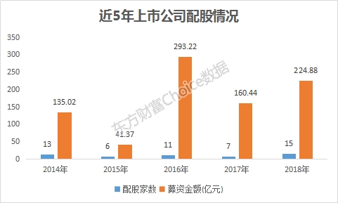 2018年有15家公司进行配股,较2017年的7家翻倍,且年内配股家数也是近5年内最多的一年。通过配股实际募资资金224.88亿元,较2017年的160.44亿元增加40.2%。