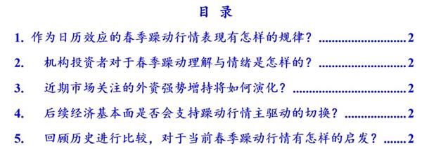 本报告从历史表现、机构投资者态度、外资增持持续性、躁动驱动力切换可能、历史比较五大视角,全面解析当前春季躁动行情。