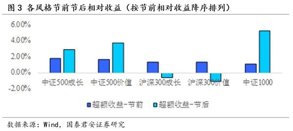 春季躁动主驱动在于投资者风险偏好提升,成长风格更为贴合投资者风险偏好的短期变化。进一步统计节前各行业的绝对收益与超额收益,对比基准选择上证综指,为保持时间长短的一致性,时间窗口设为春节前十个交易日对比春节后十个交易日。从各行业相对收益的幅度来看,春节前排名靠前的行业中周期类行业占比较高,而消费类行业整体在春节前的窗口表现并不尽如人意。春节后消费类行业的相对收益有所回升,同时电子、计算机等TMT行业表现居前。我们分别统计了沪深300成长、沪深300价值、中证500成长、中证500价值以及中证1000于春节前后10个交易日的相对上证综指的涨幅,用于探究大小盘/价值成长风格在春节效应期间会不会出现一定的分化。