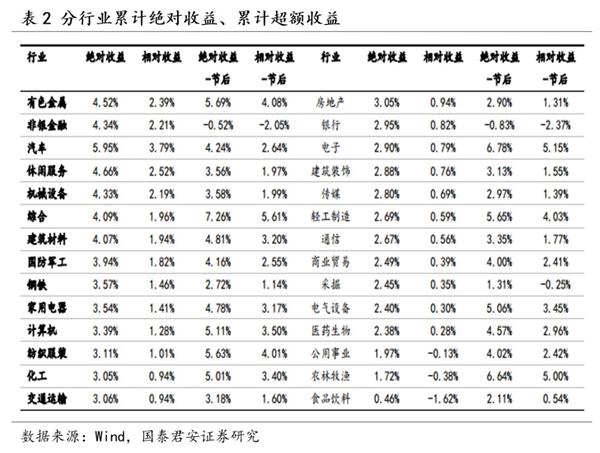 1。作为日历效应的春季躁动行情表现有怎样的规律?统计表明从春节前两周开始的确存在“春节效应”。春节效应整体是一个较为短暂的事件性投资,以春节前十个交易日为佳。春季躁动主驱动在于投资者风险偏好提升,春节前排名靠前的行业中周期类行业占比较高,春节后消费类行业的相对收益有所回升,同时电子、计算机等TMT行业表现居前。
