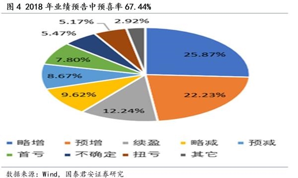 短期来看,“春季躁动”行情的驱动主要是风险偏好的阶段性提振,但影响春季行情的主要风险因素仍未消失:①中美贸易冲突风险方面,国务院副总理刘鹤将于1月30日至31日访美,就中美经贸问题进行磋商;②全球经济动能方面,美国12月PPI环比下滑0.2%,降幅大于预期,经济动能弱化,美国政府关门导致诸多重要经济数据延期发布;③信用传导方面,非标融资当前仍处于紧缩状态,内生性融资紧缩在经济信心不足情况下仍存在继续弱化的可能。一月中旬,上市公司开始进入年报业绩预告密集披露期,由于商誉减值、投资失利、诉讼缠身等因素造成业绩出现滑坡及向下修正的上市公司开始增多,商誉减值的风险尤为突出。根据东方财富网统计数据,截至1月15日,沪深两市已有1333家上市公司披露2018年业绩预告,业绩预喜(包括略增、预增、续盈、扭亏)公司共计899家,占比达到67.44%,另有27.68%的公司预告业绩同比下降,其中有107家是首亏。这些首亏公司中,已有25家在预告中确认公司存在商誉减值风险,占比高达23.36%。