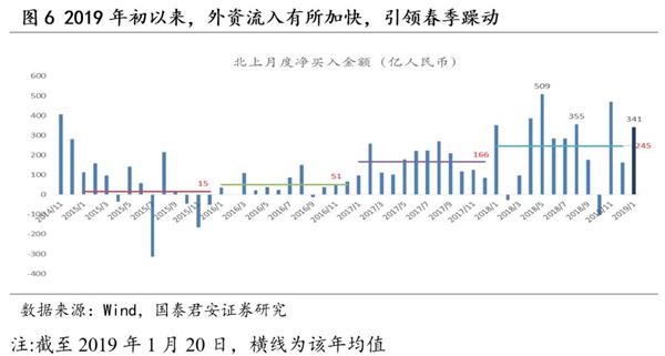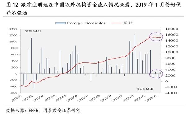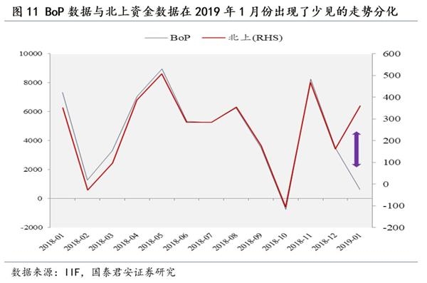本轮北上资金大幅净流入持续性存疑。2015年到2018年,北上资金流入呈现一定季节性,5月与8月为北上资金流入高峰期。2019年5月和8月,MSCI将完成指数成分评审,执行A股纳入方案,纳入比例从5%提升到20%,带动外资大幅流入。A股纳入富时罗素的过程大体一致。北上资金开年即发动春季攻势,并且大幅超配食品饮料(超配15%)、家用电器(超配9%)等基本面存在下行压力的行业,其大幅净流入的持续性存疑。此外,我们在数据交叉验证之中发现了一些“背离”, BoP数据与北上资金数据在2019年1月份出现了少见的走势分化,跟踪注册地在中国以外机构资金流入情况来看,2019年1月份好像并不强劲,这也加大了对其持续性的怀疑。