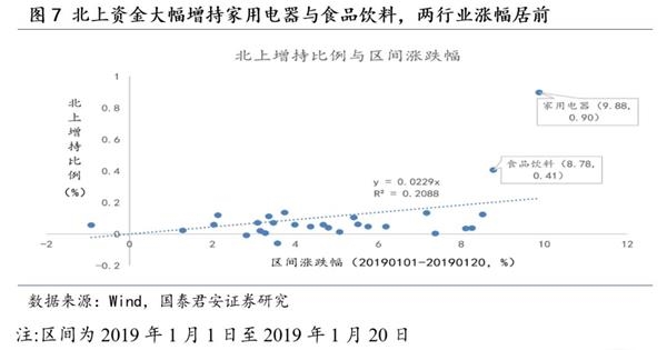 北上资金大幅流入,增持家电、食品饮料。截至2019年1月20日,北上资金净流入341亿元人民币,超过2018年北上月度净流入均值245亿元。通过对比2019年1月1日与2019年1月20日北上资金持股数据发现,北上资金大幅增持家用电器、食品饮料行业,增持比例分别为0.9%、0.41%,远超其余行业。而北上资金增持比例与该行业同期涨跌幅呈正相关性,家用电器、食品饮料行业涨幅位居前二。