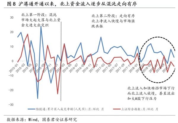 北上资金已发动过四轮攻势,市场多以下跌收场。2014年11月17日沪港通开通以来,北上资金流入逐步从混沌走向有序。2015年1月到2016年1月,北上资金大进大出与市场大起大落交织,整体处于相对混沌的状态。2016年2月后,北上资金流入逐步走向有序,基本维持净流入状态,北上资金净流入加快对于市场有积极效应,但难挡市场下行,而北上净流入放慢,甚至流出,则加大A股下行压力。北上资金发动的攻势,多以家电、食品饮料为进攻点,一旦流入减弱,市场多以下跌收场。以A股2017年6月宣告纳入MSCI作为划分,北上资金发动了四轮进攻:(一)2017年6月到8月,北上资金累计净流入增速维持9%以上,外资持续大幅流入,驱动A股连续上行,而9月外资流入放缓,市场进入调整;(二)2018年1月,外资对于中国经济新周期启动较为乐观,大幅净流入,增持电子、家电等行业,当月涨幅5.25%,但随美股暴跌,全球避险情绪上升,外资转为净流出,A股暴跌6.36%;(三)2018年5月MSCI首次纳入,北上资金创下单月净流入高点508.51亿元,但对于A股提振效应有限,A股仅上涨0.43%,而随着纳入完成,次月北上流入大幅回落,A股暴跌8.01%;(四)2018年8月MSCI二次纳入,北上净流入有所放大,但较首次纳入少150亿元,难挡A股下行,当月A股跌幅5.25%。