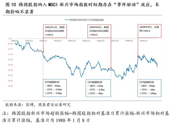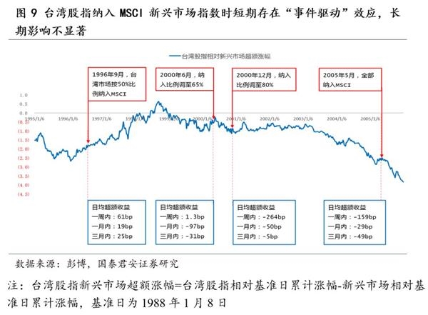 国际经验来看,纳入MSCI外资流入短期偏交易扰动,长期影响不显著。自1988年MSCI发布新兴市场指数以来,共有13个新兴股票市场纳入该指数,但只有台湾和韩国是跟A股类似的“逐步纳入”。因此,选取台湾和韩国案例复盘分析。为剔除新兴市场涨幅对当地股指涨幅的影响,分析纳入MSCI对当地股指的净作用,剔除规则为:当地股指新兴市场超额涨幅=当地股指相对基准日累计涨幅-新兴市场相对基准日累计涨幅,基准日为1988年1月8日。通过分析台湾和韩国的案例可以发现,初次纳入当周股指显著跑赢MSCI新兴市场,但随着时间的推移,跑赢幅度在下滑,甚至还有跑输的情况。其次,对比台韩纳入进程,台湾初次纳入比例为50%,后续纳入比例边际降低,效应弱化,韩国初次纳入比例为20%,后续纳入比例逐次提升,效应强化。但长期来看,纳入MSCI对当地股市相较于新兴市场超额涨幅影响接近中性。