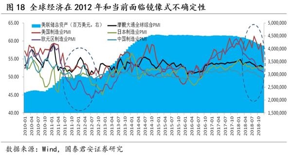 相较2012年宏观环境,当前具有相似性,但预期要更偏悲观。市场对于后市演化的预期主要从所谓政策底-金融底-经济底的传导路径进行理解。对于2012年我们会发现有以下相似之处:1)从市场表现来看,2011年和2018年均经历了全年的下跌;2)从经济周期角度看,2011年与2018年均处于一轮库存周期的尾声;3)从政策底来看,2011年11月降准正式确立,而2018年7月之后政策层面明显转向友好。但是,从宽货币到宽信用,最终到经济动能的传导来看,当前传导效果要显著弱于2012年。而从外围环境来看,2012年市场受到全球经济复苏不稳定,而美欧央行货币政策处于宽松趋势中,而当前是全球经济有放缓趋势,美欧央行货币政策处于紧缩趋势中,但有节奏放缓预期。从市场预期来看,一方面是经济下行趋势,盈利增速继续下修的风险,另一方面是政策宽松对冲,且进一步宽松预期升温驱动风险偏好,同样面临着政策对冲发力节奏与经济下行节奏之间的赛跑局面,从这一角度看本轮的春季躁动空间以及持续性预计相对较弱。