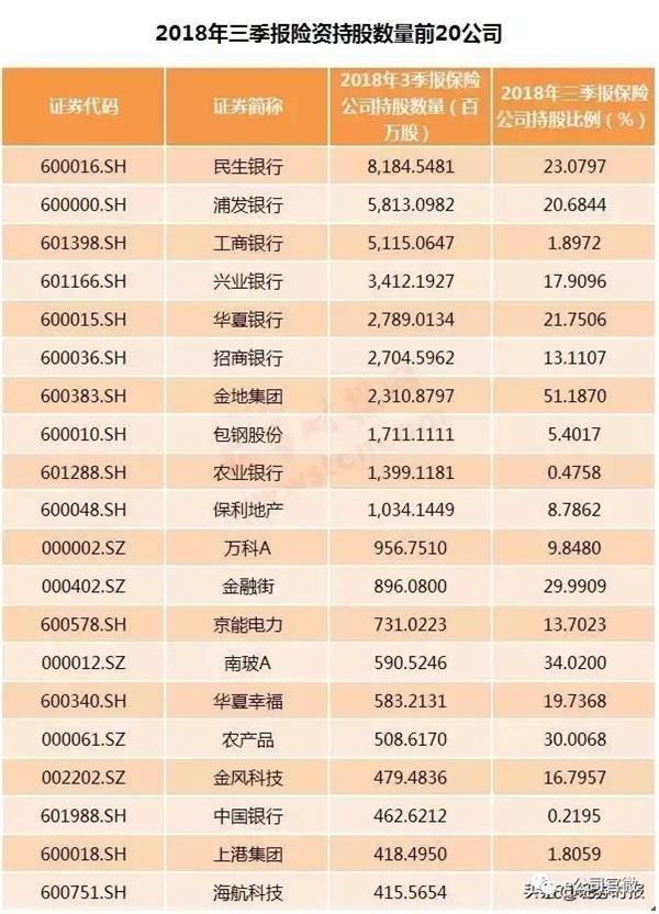 截至去年3季度末,险资共持有433家上市公司股份,其中险资持股数量前20名上市公司中,8家是银行,民生银行、浦发银行、工商银行等上市银行占据了前6席;5家是上市房企,保利地产、金地集团、万科A等名列其中。