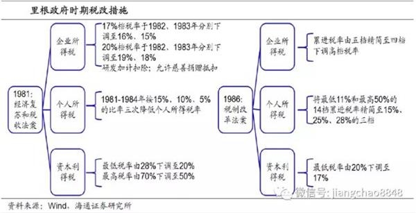 里根的另一大政策主张是减税,其在任期内实施了两次大规模减税政策,将企业所得税、个人所得税和资本利得税三大税率均大幅下调。而大幅减税激活了美国企业的研发创新和居民消费,使得经济重新恢复了活力。美国经济在1983年以后重拾高增长,失业率也从10%以上的高位缓慢下降。自里根上台以后美国经济终于摆脱了持续十余年的滞胀局面,并为之后克林顿的繁荣时代打下了基础。