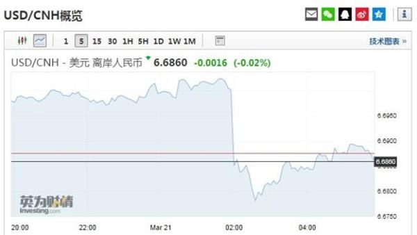 离岸人民币较3月20日内高点飙升400点,决议公布后短线大涨逾200点,盘中一度连收6.69,6.68两道关口。