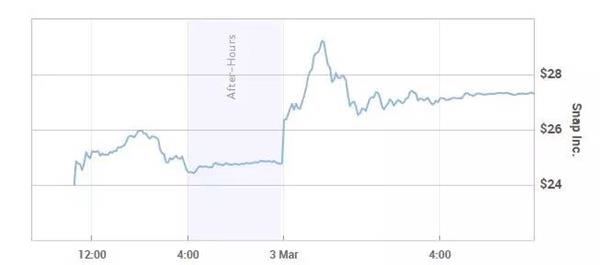 Snap的IPO定价为每股17美元,高于每股14-16美元的预期目标区间。2日上市首日开盘价为24美元,较发行价上涨41.2%,最终收盘报于24.48美元,较发行价大涨44%,上周五股价进一步上涨10.66%,收盘达到每股27美元,市值增至313亿美元。