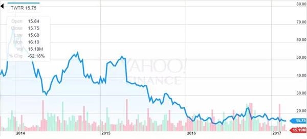 Twitter成立于2006年,2013年11月上市前估值为180亿美元,IPO首日股价较发行价暴涨73%,曾是美股市场上市首日表现最好的股票之一。但投资者的热情并没有持续多久,IPO仅一个月后Twitter股价开始坠落。随着市场对其用户增长的担忧日趋加剧,Twitter股价在2015年底跌破发行价,当前股价较发行价已经低近40%。