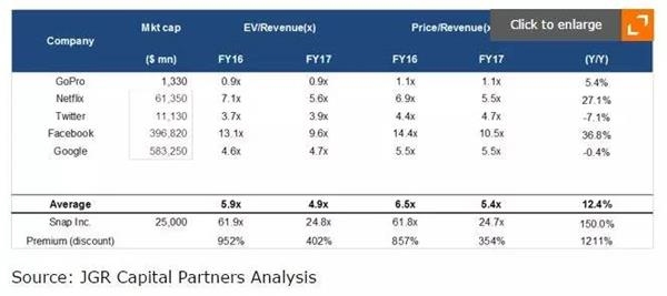下图是JGR资本合伙人公司梳理的Snap估值对比数据,无论是较同业公司还是较近年来涌现的新兴科技龙头企业,Snap的估值都显著偏高。