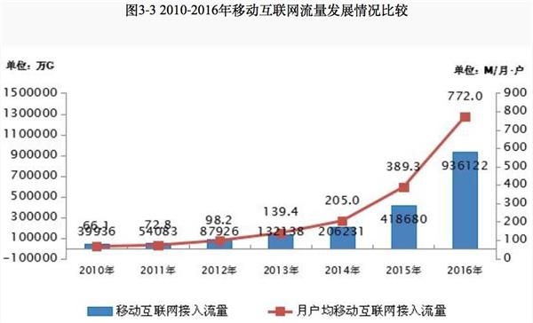 2016年,在4G移动电话用户大幅增长、移动互联网应用加快普及的带动下,移动互联网接入流量消费达93.6亿G,同比增长123.7%,比上年提高20.7个百分点。其中,通过手机上网的流量达到84.2亿G,同比增长124.1%,在总流量中的比重达到90.0%。