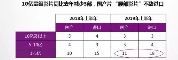 《报告》显示,2019上半年,仅《流浪地球》与《复仇者联盟4》就吞下29%的票房和24%的观影人次。此外,《2019上半年电影市场景气洞察》则显示,今年上半年新上映影片242部,同比去年增加18部,但票房表现并不好。10亿量级影片总体减少了3部,共42部影片过亿,其中国产片总票房过亿数量不敌进口片,尤其在1~5亿之间的“腰部”影片数量较少。