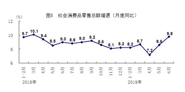 上半年,社会消费品零售总额195210亿元,同比增长8.4%,增速比一季度加快0.1个百分点。6月份,社会消费品零售总额33878亿元,同比增长9.8%,比上月加快1.2个百分点,环比增长0.96%。上半年,按经营单位所在地分,城镇消费品零售额166924亿元,同比增长8.3%;乡村消费品零售额28286亿元,增长9.1%。按消费类型分,餐饮收入21279亿元,增长9.4%;商品零售173930亿元,增长8.3%。消费升级类商品销售增长较快,限额以上单位化妆品类同比增长13.2%,增速快于社会消费品零售总额4.8个百分点。