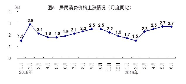 上半年,全国居民消费价格同比上涨2.2%,涨幅比一季度扩大0.4个百分点。其中,城市和农村均上涨2.2%。分类别看,食品烟酒价格同比上涨3.9%,衣着上涨1.8%,居住上涨2.0%,生活用品及服务上涨1.1%,交通和通信下降1.0%,教育文化和娱乐上涨2.5%,医疗保健上涨2.6%,其他用品和服务上涨2.2%。在食品烟酒价格中,粮食价格上涨0.5%,猪肉价格上涨7.7%,鲜菜价格上涨9.2%。扣除食品和能源价格后的核心CPI同比上涨1.8%,涨幅比一季度回落0.1个百分点。6月份,全国居民消费价格同比上涨2.7%,涨幅与上月持平;环比下降0.1%。