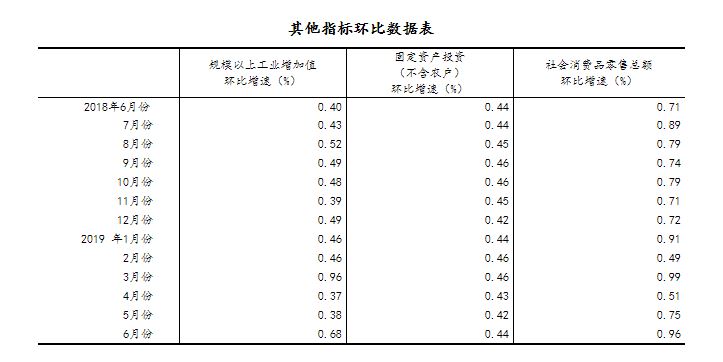 (2)根据季节调整模型自动修正结果,对近一年来各期国内生产总值、规模以上工业增加值、固定资产投资(不含农户)、社会消费品零售总额环比增速进行修订。修订结果及2019年二季度GDP环比数据、2019年6月份其他指标环比数据如下: