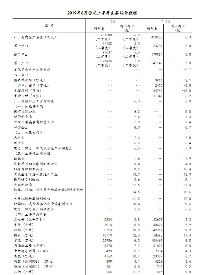 总的来看,上半年国民经济运行在合理区间,延续了总体平稳、稳中有进发展态势。但也要看到,当前国内外经济形势依然复杂严峻,全球经济增长有所放缓,外部不稳定不确定因素增多,国内发展不平衡不充分问题仍较突出,经济面临新的下行压力。下一步,要以习近平新时代中国特色社会主义思想为指导,认真贯彻落实党中央国务院各项决策部署,坚持稳中求进工作总基调,坚持以供给侧结构性改革为主线,按照高质量发展要求,深化改革开放,优化营商环境,推进关键领域自主创新,充分调动各方面积极性,狠抓“六稳”政策落实落地,推动经济平稳健康发展。